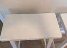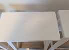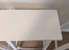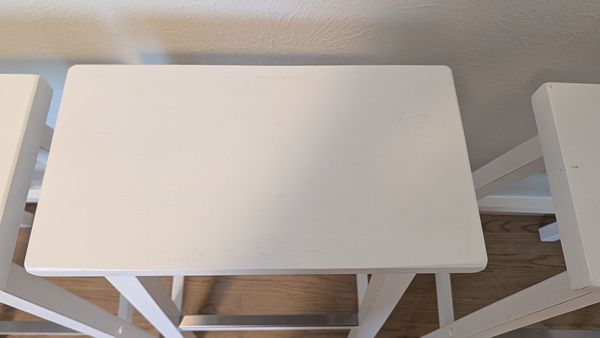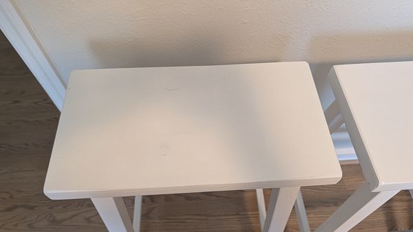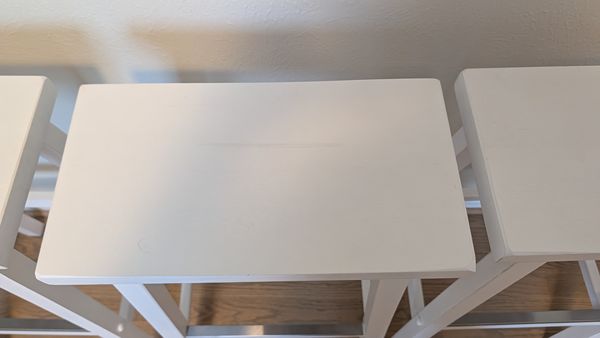 Set of 4 white solid wood saddle-seat counter height Bar Stools. Some nicks and scuffs but genenrally in very good shape.