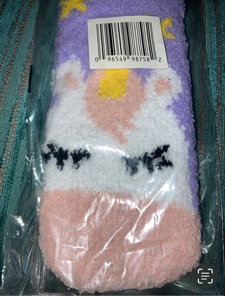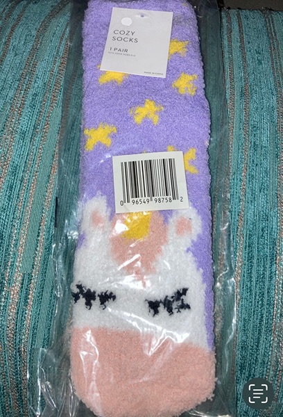 Cozy, soft, and fuzzy unicorn, penguin, and striped crew socks. New in package, fits ladies sock sizes 9-11. $5 each or $10/all