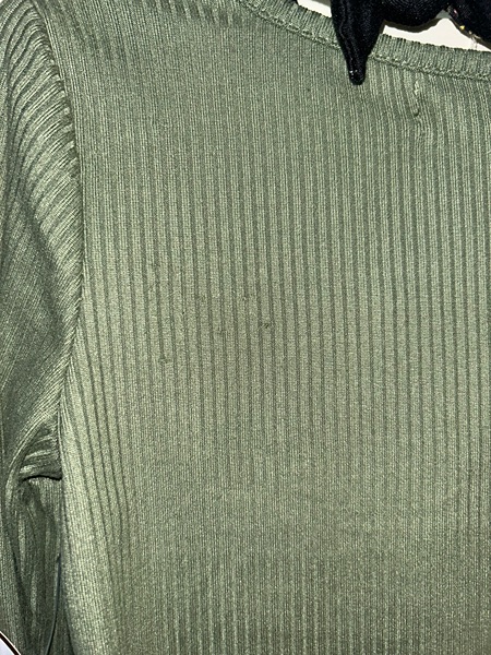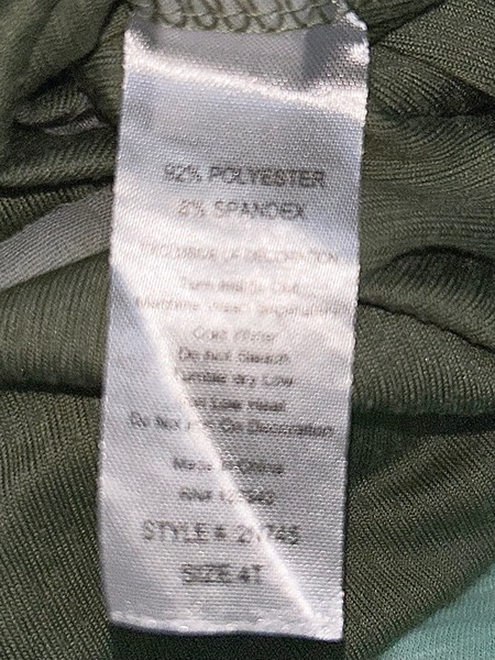 This outfit contains an olive rib knit long sleeve tie-front top with a sparkly, sequin unicorn; black floral print leggings; and bonus matching floral tie headband. Girls size 4T. The material is super soft. It's new with tags, but the pants hanger rubbed against the back of the shirt, creating small snags on the shoulder blade areas (pictured). $8