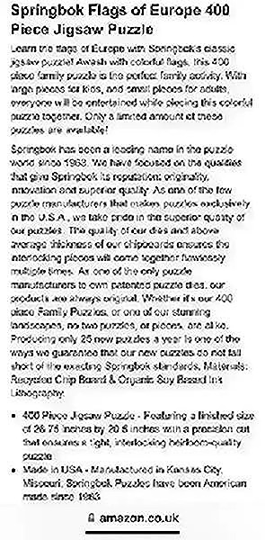 Springbok 400 piece family puzzle. It has “big pieces for kids and little pieces for grown-ups” so the whole family can do the puzzle together. ~ finished puzzle is approximately 26.75 in x 20.5 in. Used are listed for $32-$51 on EBay and $125+ shipping on Amazon…$20 firm