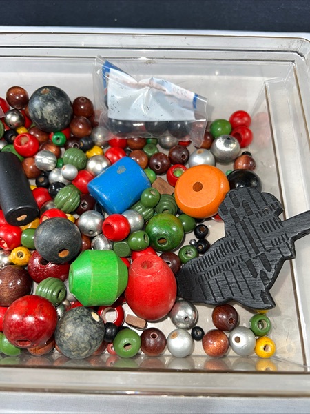 Lot 600+ Wooden Beads Varity Of Color, Shape And Size. Longest 2”, widest 1 1/8”. Smallest 1/8” wide. Most are smooth, I see ribbed, green, and black and silver. There may be some beads mixed in that are not wood.