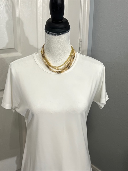 Iman Global Chic Women's white Polyester/spandex classic pullover short aleeve Top Size XS. Machine wash. Perfect for under a suit jacket. Dress down with shorts, black pants. Super comfortable. Brand new with tag. Under arm to under arm 17 inches. Top of the back of neck to the bottom of shirt 22”.