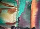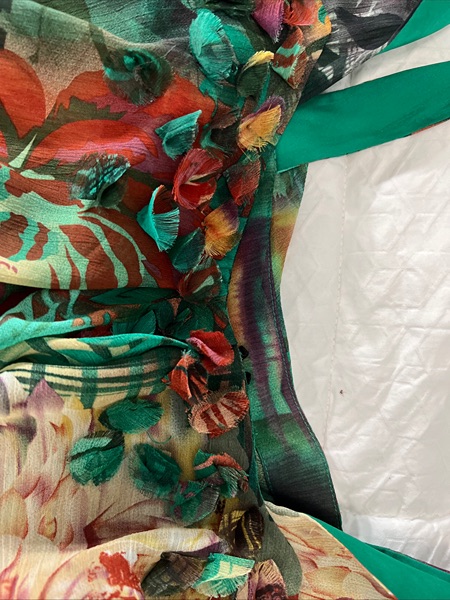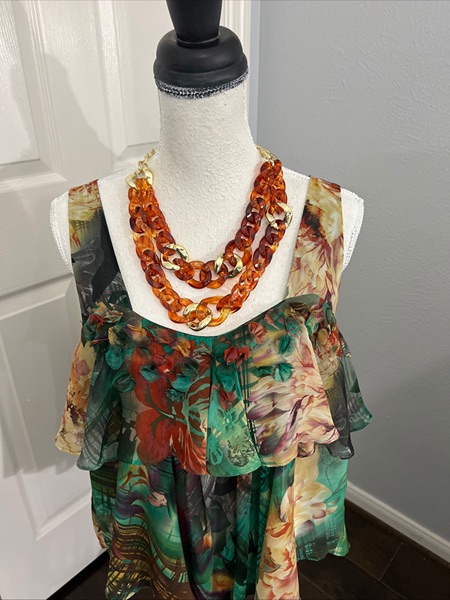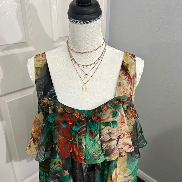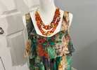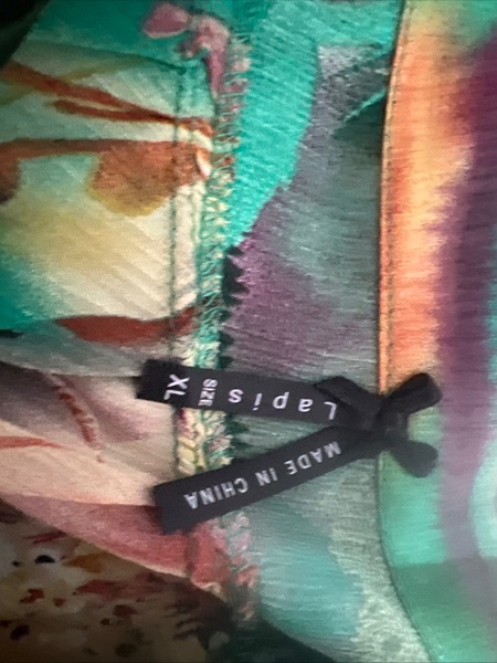 LAPIS brand Womens Abstract Jungle Print Tiered Ruffled Hem Sleeveless Blouse Sz XL. Cropped short in back. Adorable pieces of the same fabric are turned into small flowers along front tiered bodice. Lower back line. Top of the strap to bottom of the front of the blouse 25 inches. Top of the strap to the bottom of the back of shirt 21 1/2 inches. Excellent used condition.