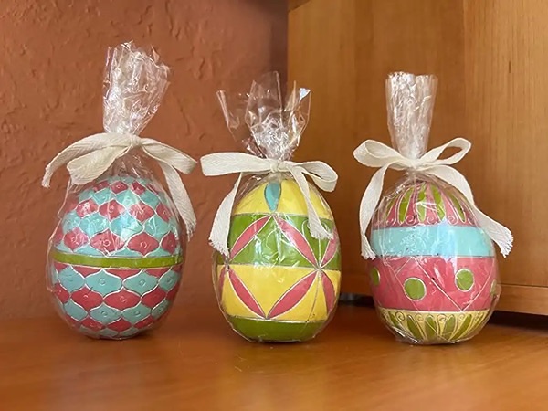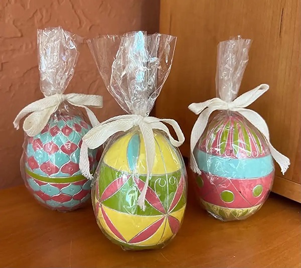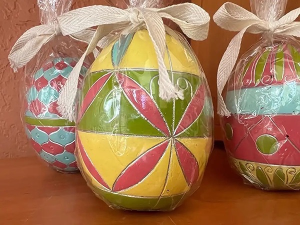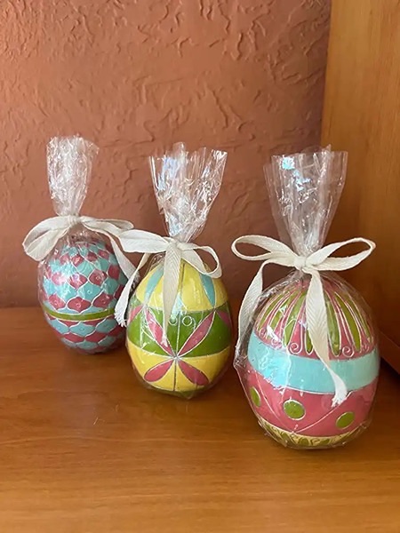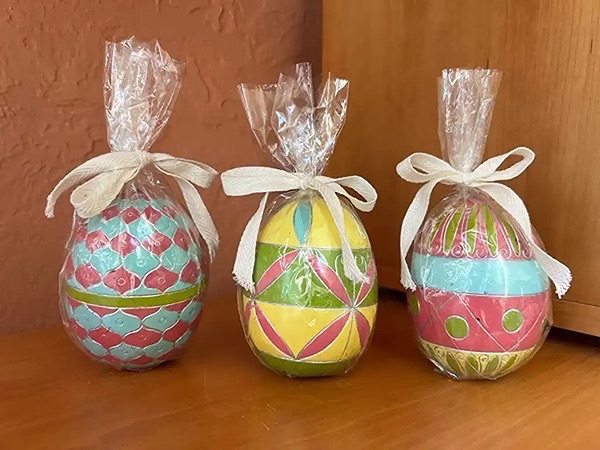 These are new in that they’ve never been burned, only set out for mantle decor. Some have a few little scuff marks but not really noticeable. Approx. 4” x 3 1/2”each. Would look great on your Easter table scape…$25 firm