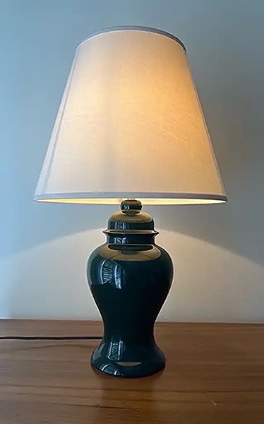 Dark green ceramic table lamp with a white shade. Approx. 21” tall x 13” at widest part of shade…$12 firm