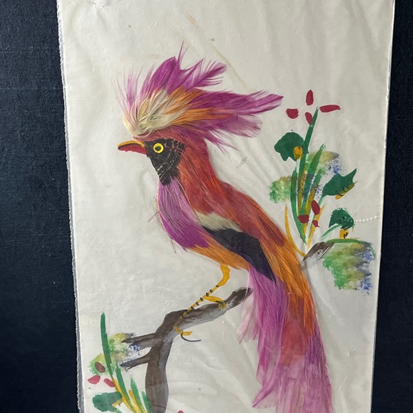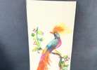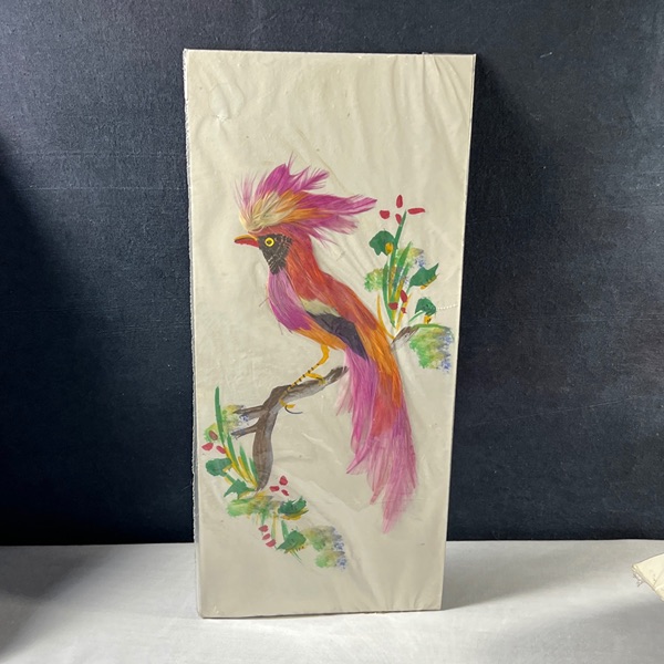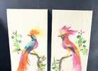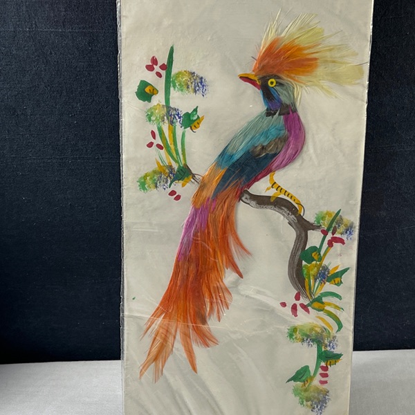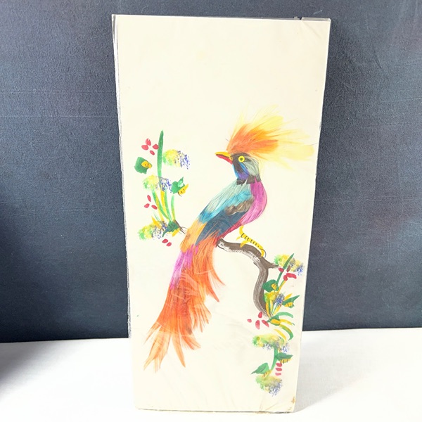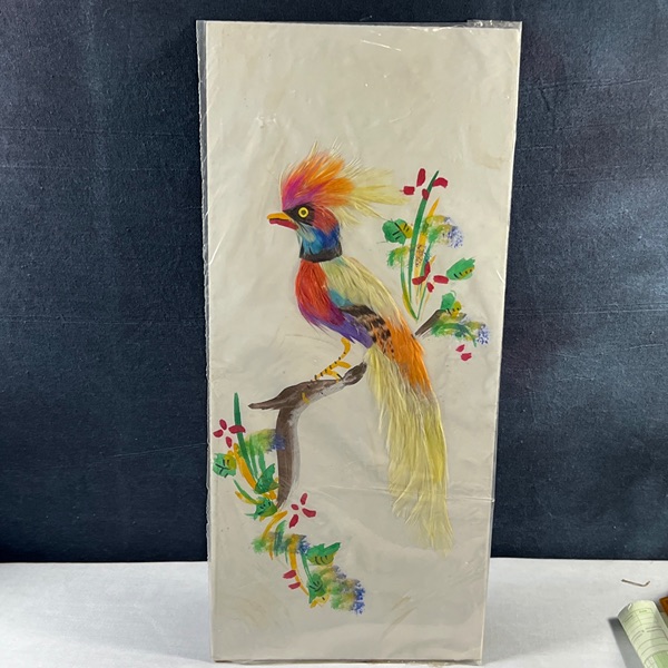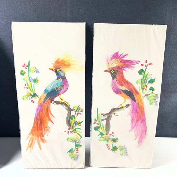 Pair of beautiful Colorful made in Mexico 6x14 Feather Art Bird Paintings Unframed, new in package. Combination of painting and feathers. unsigned. There are 2 different sets of 2 to choose from. $50.00 a set of 2 Please see the pictures.