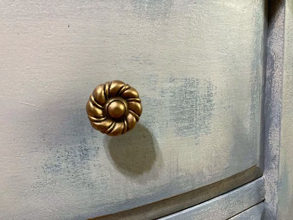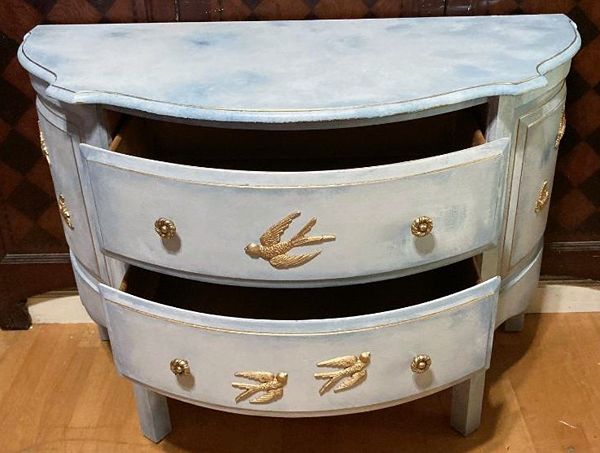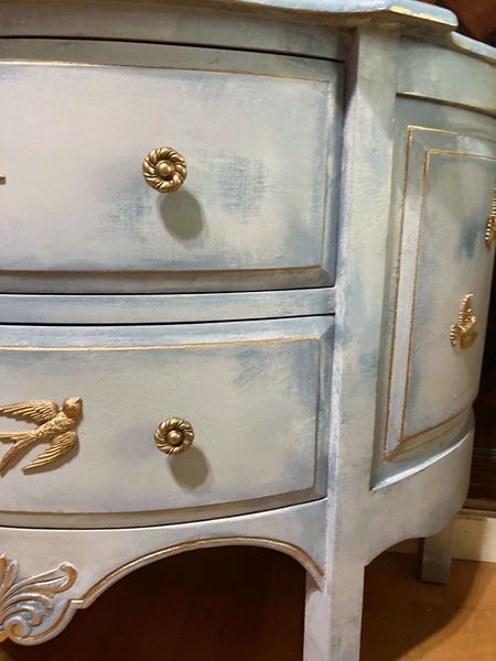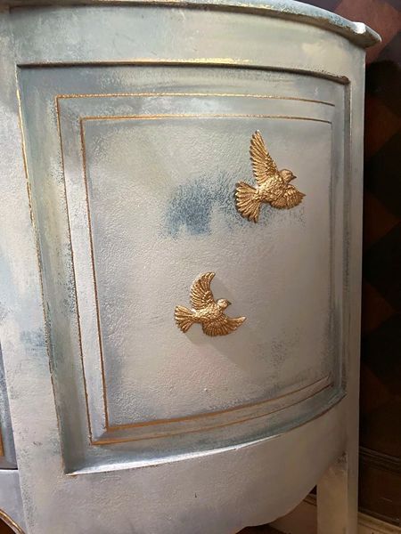 - We cleaned, filled, sanded, primed, added layers of creams and blues for a beautiful cloudy sky look. Then I applied hand poured moulds of birds, gilded and sealed for durability.