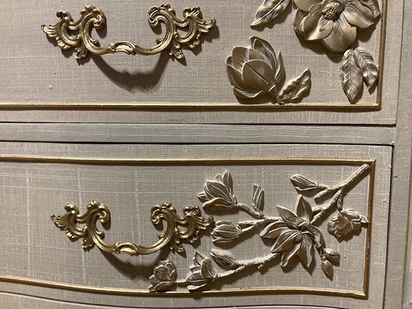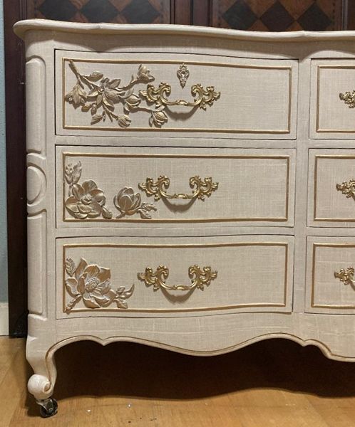 - We cleaned, filled, sanded, primed, added texture then lovely beige glazes in layers, Hand poured moulds of magnolias then attached, finally we gilded and sealed for durability.