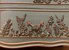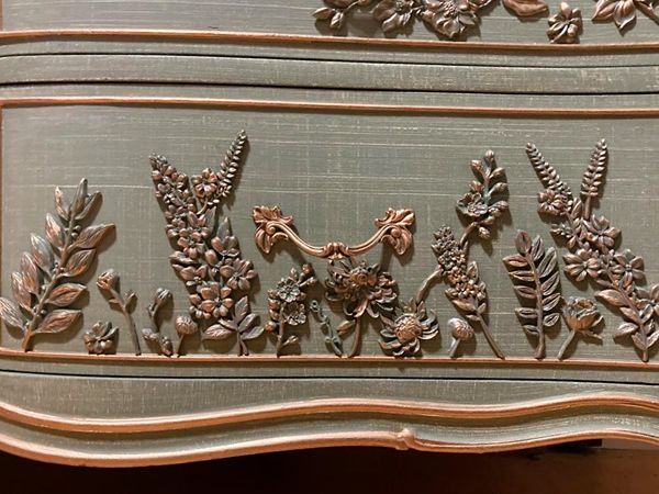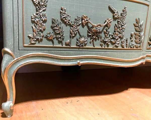 - We cleaned, filled, sanded, primed, added worn linen paint in layers, Hand poured moulds of florals and birds then attached, finally we gilded and sealed for durability.