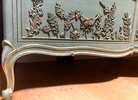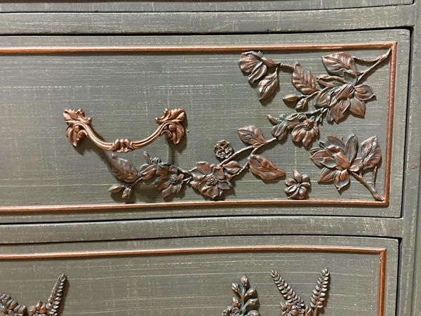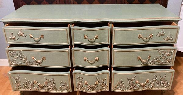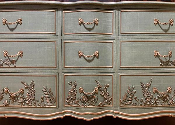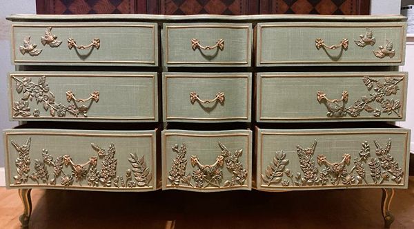 Elegant Drexel Touraine, Thyme Green Linen Textured Dresser w/Hand Poured Floral & Bird Molds Photos
