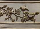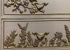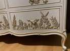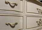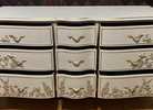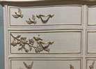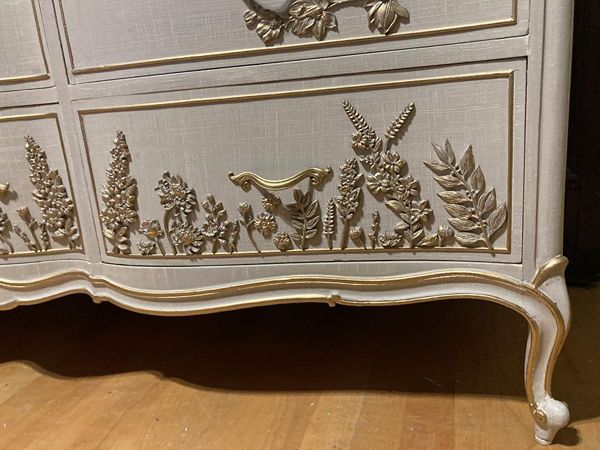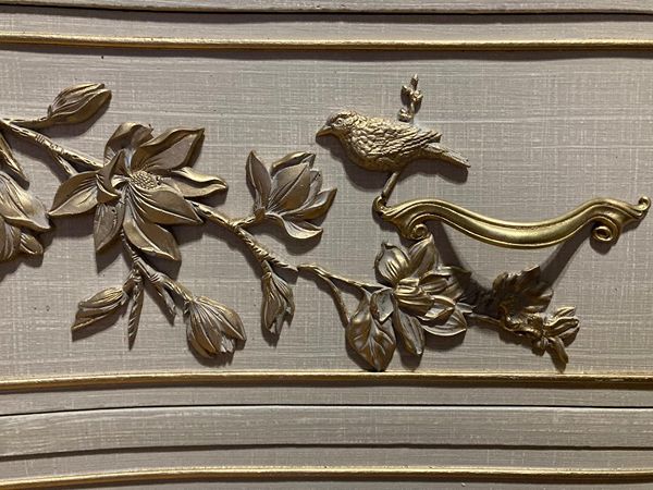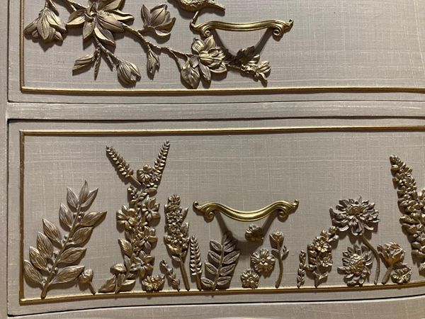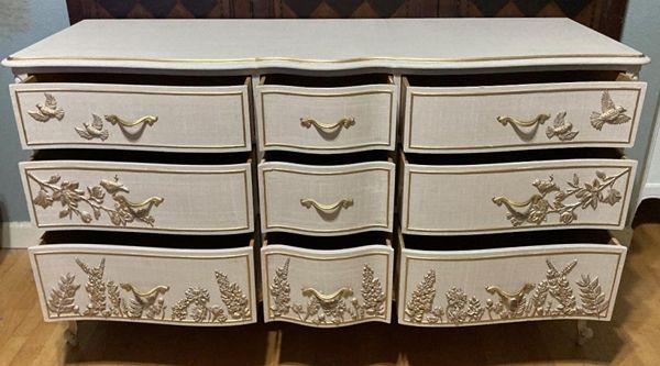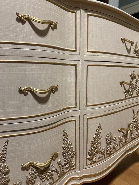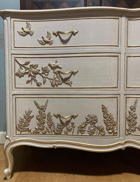 - We cleaned, filled, sanded, primed, added worn linen texture paint and glazed in layers. We hand poured molds of flowers and birds and composed them on the drawers. We layered the glaze in soft neutral beige color then gilded the molds and highlighted the trims. Then we sealed with polycrylic for durability.
