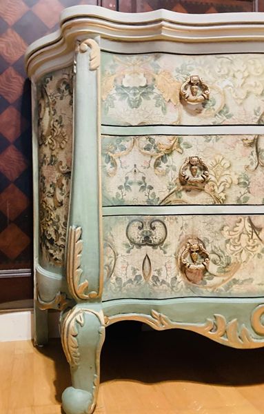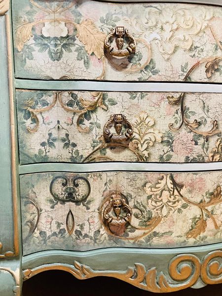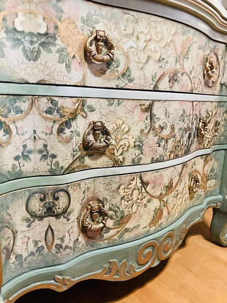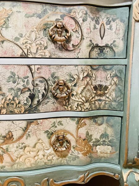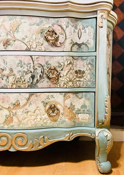 - We cleaned, filled, sanded, primed, blended shades of greens and golds, applied a complementary beautiful scroll design, gilded then sealed for durability.