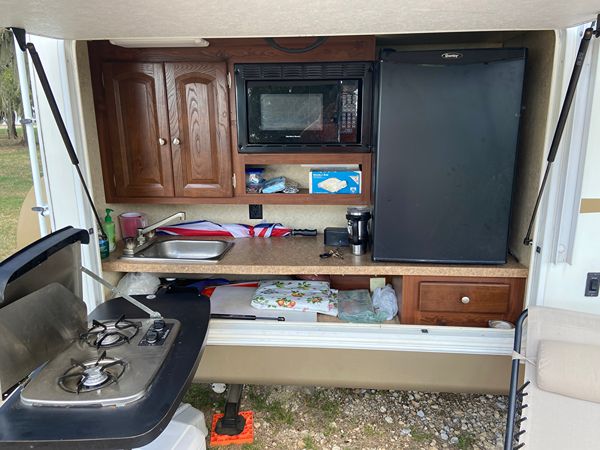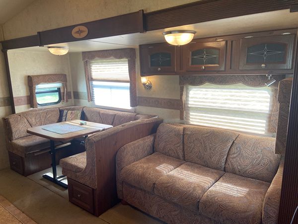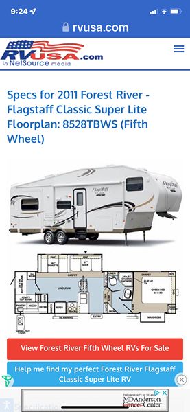 2011 Forest River Flagstaff Classic Super Lite 5th Wheel--Floorplan 8528 TBWS. 2 Slide outs. (one is closet in front bed) Huge amount of pass through storage. Door to back bunk room where bottom bed folds up for additional storage (bikes etc.) Power Awning and jacks. Always stored under Covered storage. Upgraded Mattress in Primary Bed, 2 TV's, (one in one out) Dinette can also make a bed, Bunk House in Back, Cold A/C with ducts to bedrooms, Outdoor Kitchen features Large Fridge, 2 Burner fold out Cook Top, Microwave, Sink and pull down TV in front of Microwave outside. 2 total microwaves, one inside and one outside. Receiver hitch on back to the frame for additional towing needs if desired etc. Kids are grown and we just don't use it enough anymore. $12,500 obo