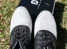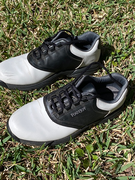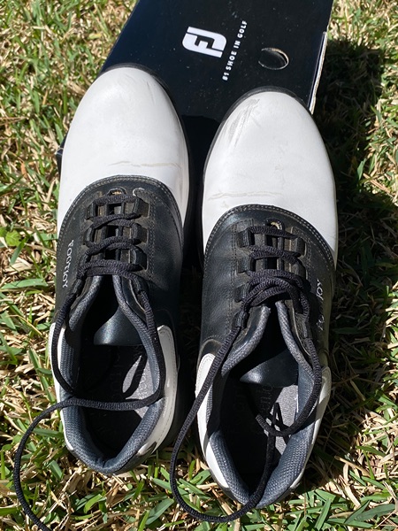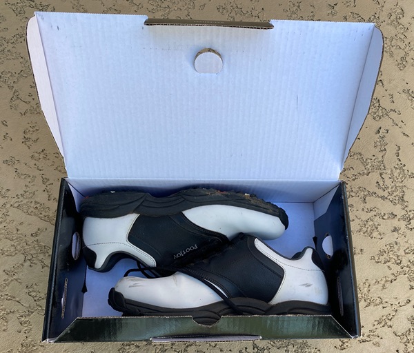 Very nice, lightly used FootJoy golf shoes: "GreenJoys", size 9. Great condition and always kept stored in the original box. A super deal at only $10.00.