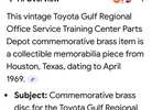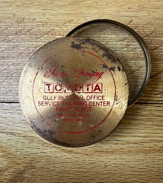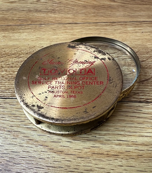 This vintage Toyota Gulf Regional Office Service Training Center Parts Depot commemorative brass magnifying glass is a collectible memorabilia piece from Houston, Texas, dating to April 1969.
