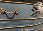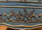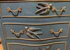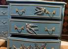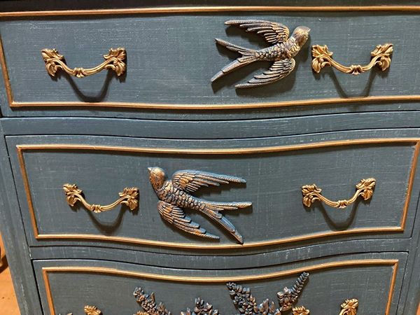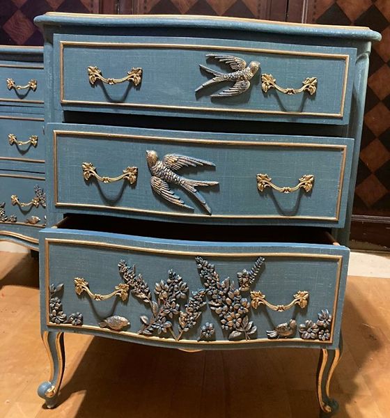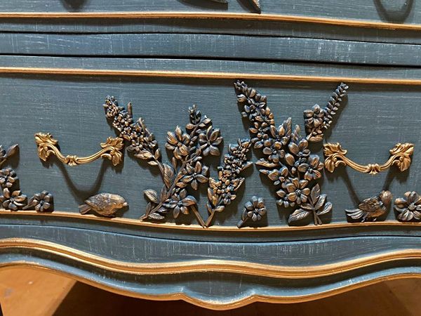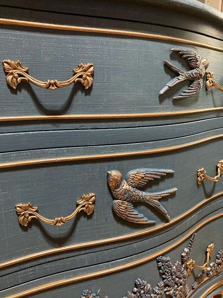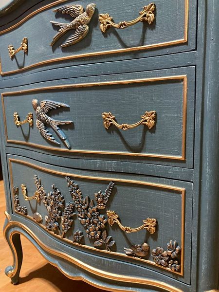 - We cleaned, filled, sanded, primed, added worn denim texture, applied hand poured moulds of birds and florals, then painted in layers, gilded and sealed for durability.