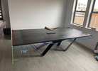 Beautiful oversized dining table with a premium solid wood top and a custom geometric metal base. This is a high-end designer piece that easily seats 10 people comfortably (up to 12).
