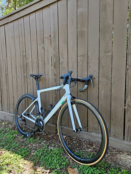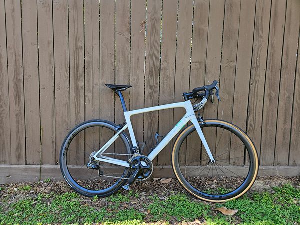 Featherweight 16lb custom made 56cm carbon fiber road bike with Shimano Di2 11 speed shifting. Like new condition, very low miles. Meticulously maintained. I personally built this road bike as I wanted a sub 17lb road bike with electronic shifting. Built with all brand new components including a very light and strong quality carbon fiber wheelset (1325g) with ceramic bearings, Carbon handlebars, carbon seat post, carbon saddle, and carbon frame and fork. Intentionally built with rim brakes which I believe to be a superior choice to disc brakes for road bikes. Extremely easy to maintain and adjust, (no squealing or disc rubbing) while being generally lighter. Rim brakes are becoming harder to come by on modern bikes. No branding with a minimal green accent on the frame which I ordered from the factory to have a discrete, clean look. I have ordered extra parts including several headset bearings, a spare carbon seat post and derailleur hanger I will include.