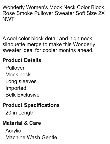 Brand is Wonderly, size 2x. Mock neck pullover cropped sweater in rose smoke color block. New with tags from smoke free home. Originally $88, asking $13.