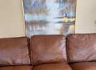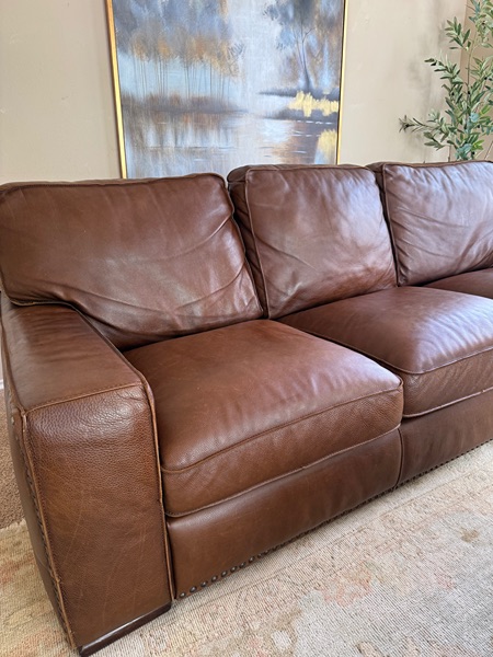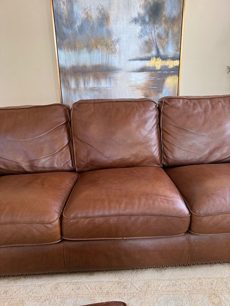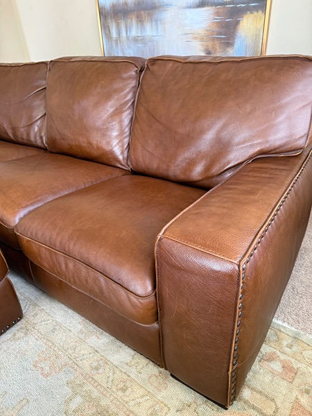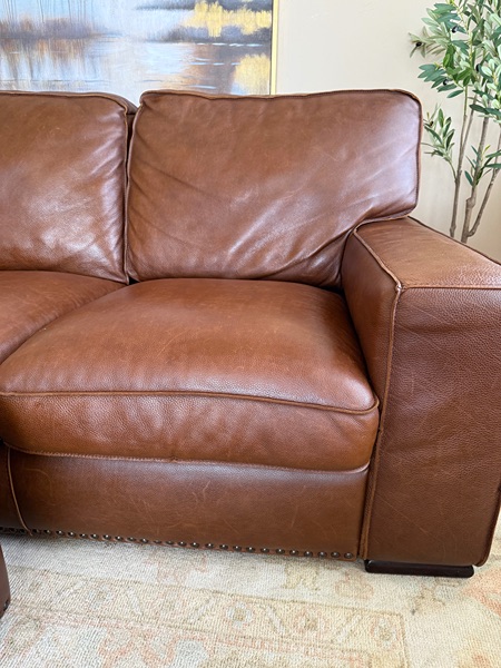 Gorgeous Top Grain Leather Sofa with matching ottoman. It’s in GREAT condition. No rips or stains. Signs of Normal wear. Cushions are plushed and comfortable. There’s no sagging. Beautiful studded details. Just been conditioned & ready for its new home.