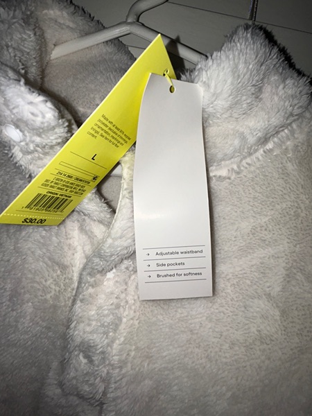 Brand is All in Motion, size large, color is cream. Has snap front, kangaroo pouch, adjustable waistband, super soft fabric, and high neckline. New with tags from smoke free home. $12