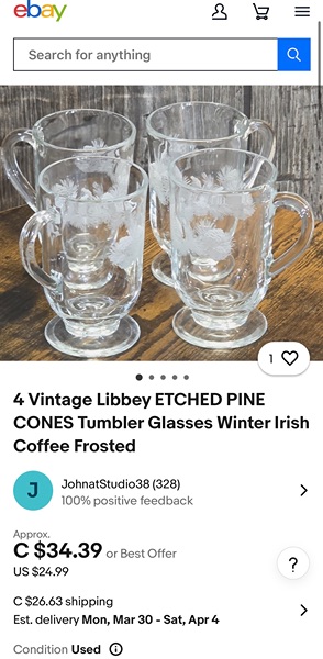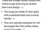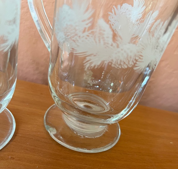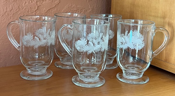 These are vintage Libbey footed Irish coffee mugs featuring an etched pine cone design. Woodlands theme!