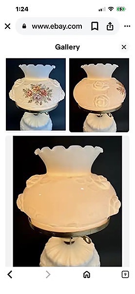 • Structure: Comprised of milk glass with brass or metal accents and a glass chimney. •