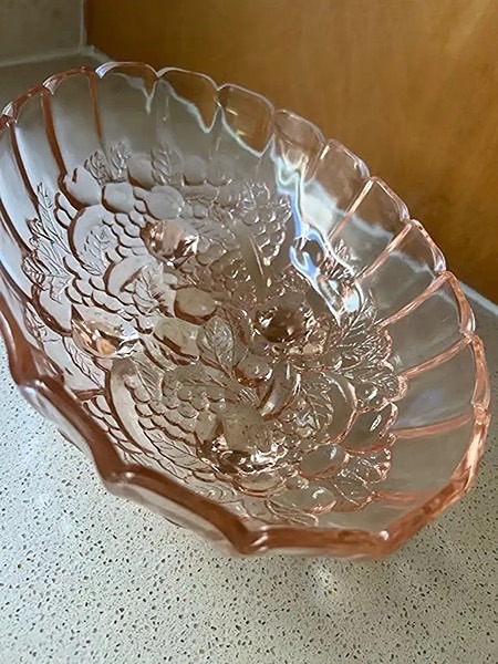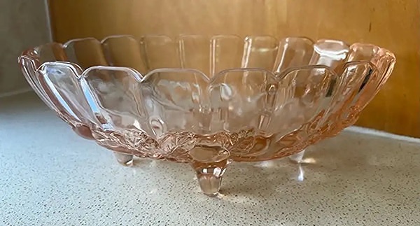 This is a vintage Indiana Glass Co. oval footed fruit bowl in the Garland or Harvest Grape pattern, made of pink depression glass. •