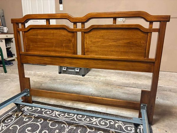 Elevate your bedroom with this beautiful, high-quality wood headboard. This is a professional-grade piece manufactured By Thomasville Furniture in January 1993 (stamped 01-93), featuring a stunning sculpted "camelback" design with unique wavy paneling. It offers a perfect blend of Mid-Century Modern inspiration and 90s transitional elegance. High-quality Walnut/Pecan wood with a rich, warm honey finish. Elegant scalloped top rail and dual inset panels. Very sturdy and well-crafted. Excellent vintage condition, no major scratches or structural issues. Size: Fits Queen/Full beds (Standard mounting).Includes the adjustable heavy-duty metal bed frame with casters (wheels) for easy movement. Pickup only. The Woodlands Near Carlton Woods area.