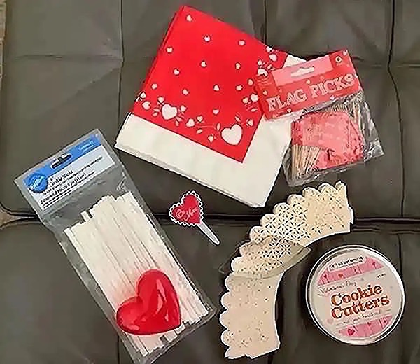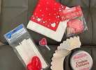 Most are new- Wilton cookie sticks, lips and hearts cookie cutters, flag picks for cupcakes, cupcake dresses, napkins and other misc….$15 firm