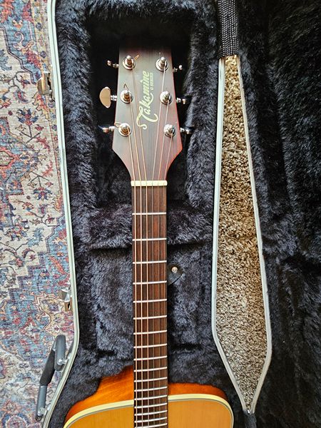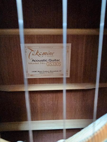 Lightly used Takamine GS330S dreadnought acoustic guitar with original hard case. Solid spruce top, mahogany back/sides, warm tone and good projection.