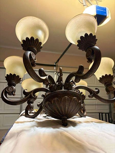 Elegant Mediterranean-style (Tuscan-style) chandelier, like new. Made of iron and a bronze alloy with a dark, textured "oil-rubbed bronze" finish, giving it a deep brown color with coppery undertones. It features six curved arms that hold the lights, with ornamental scrollwork and stylized leaf details on the central body and arms. Includes a thick chain and a ceiling canopy (the round piece that attaches to the ceiling) with the same finish and decorative design as the rest of the chandelier. Dimensions: Height 45”, Width 29”, Base 10”. The shades (in the shape of an inverted tulip) are made of frosted glass with a soft amber tint, which helps to diffuse the light and create a warm ambiance. It comes with the wiring and chain ready for installation. This type of chandelier is ideal for a dining room, entryway, or living room with classic decor. MUST GO