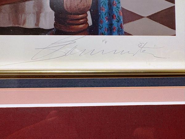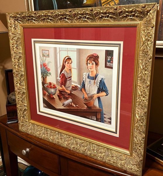 The art work depicts two young women in a kitchen setting, engaged in the activity of baking, with ingredients like apples and a rolling pin visible on a table. Pati Bannister is known for her romantic and nostalgic art, often featuring young women and themes of childhood or domestic life. The ART work comes with a matted fantastic frame in pristine condition. Produced in 1990, this contemporary piece reflects the style of illustration art and is an original print from the United States. The artwork is a collectible item that would make a lovely addition to any art lover's collection. Compare