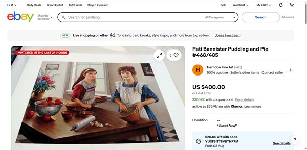 Beautiful Artwork "Pudding and Pie" by artist Pati Bannister is a large, beautifully illustrated print. Its hand signed and numbered with a certificate of authenticity. **Type**: Limited edition fine art print, signed and numbered *Edition**408 of 485*. Measures: Length 31. 1/4 Height 28”, Width 2”. **Condition**: Excellent; gallery-preserved