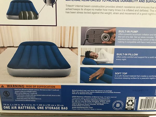 We have two Twin Airbeds not opened and new. Each measures 74 inches by 39 inches by 12 inches at the built in pillow end. Perfect for kids' sleep overs, especially since you can pack the bed away when you don't need them! We are located in Woodforest. The airbeds are $10 for each one.