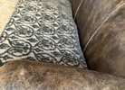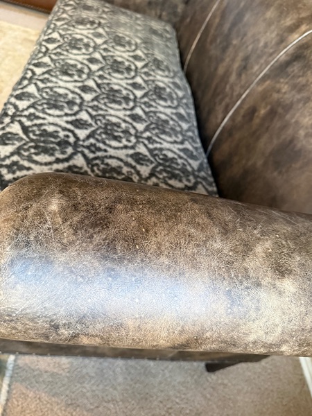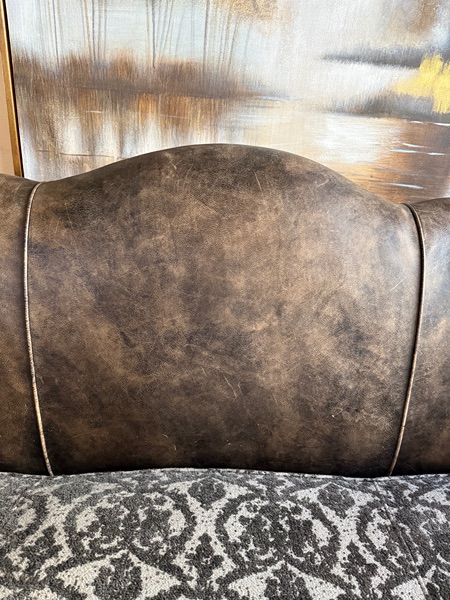 This beauty is in GREAT condition. There’s no rips or tears. Curved back frame. Bench cover is very well made and It is washable- Theres no stain, signs of minimal wear. 9” legs (removable for easy transport) studded details along the trim. Theres a few scuffs on the backside. It’s REAL leather. Just been cleaned and conditioned