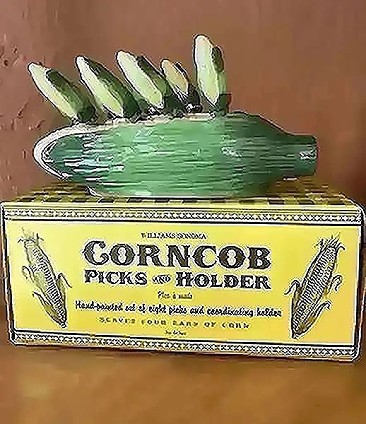 Hand-painted ceramic corncob holder plus 8 corn picks from Williams-Sonoma. Would make a great gift! From early 2000, never used and no longer sold in stores…$15 firm