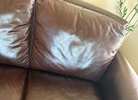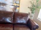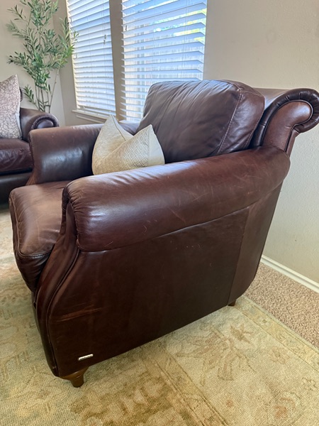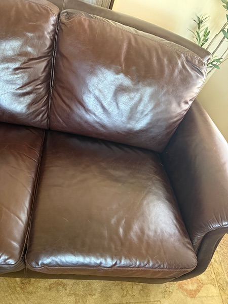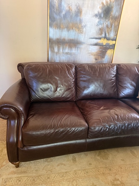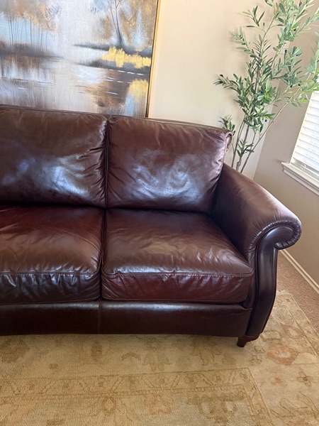 TOP GRAIN Leather and it’s made in Italy. Beautiful brown color leather. No rips or tears. Normal wear. Very sturdy and heavy. This sofa set is well taken care of and high quality. Cushions are attached so it will always stay in place. Just conditioned it & ready for its new home.
