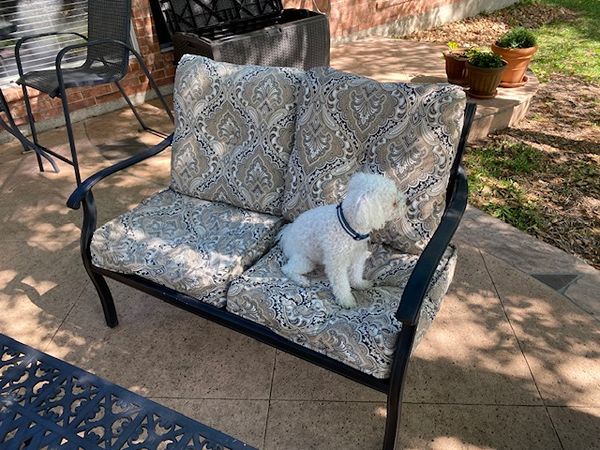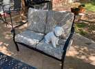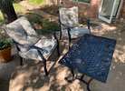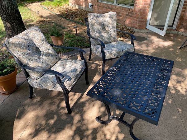 A set of aluminum patio furniture (painted black), two chairs, one couch, and one table. Includes cushions as shown and the brown plastic storage bin.