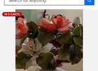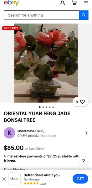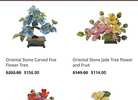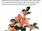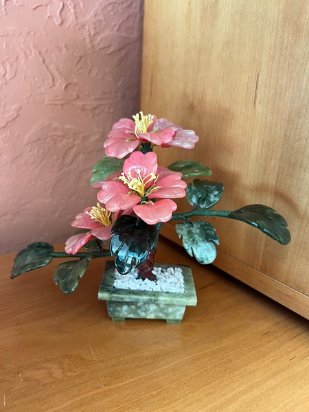 This item is a vintage Chinese carved jade flower tree bonsai, featuring hand-carved leaves and a base made from green jade, with blossoms fashioned from other stones like rose quartz. ®