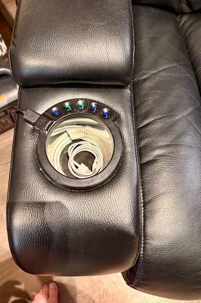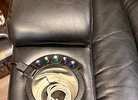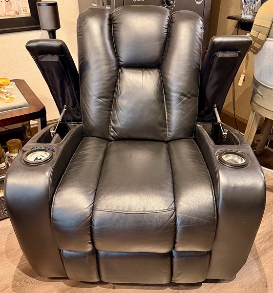 Electric Recliner with touch Botton reclining and head rest. It also has two cup holders and storage under each armrest. It also has a USB-A plug by on of the cup holders.
