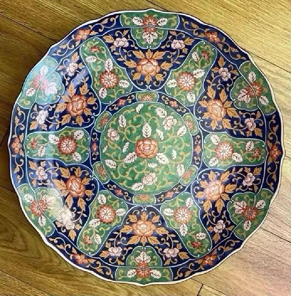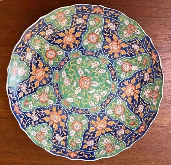 I’m unsure of the maker but it has a mark or stamp that is either Japanese or Chinese. It has scalloped edges and a beautiful, vibrant, textured floral pattern that is even more stunning in person. It measures 13” in diameter…$35 firm