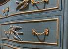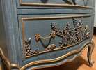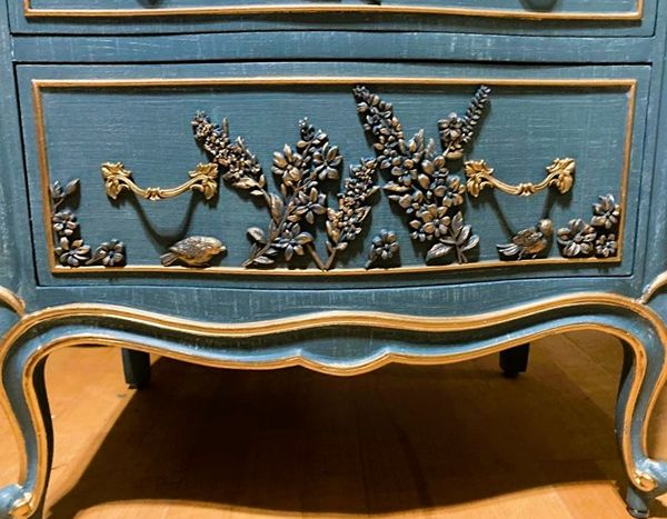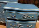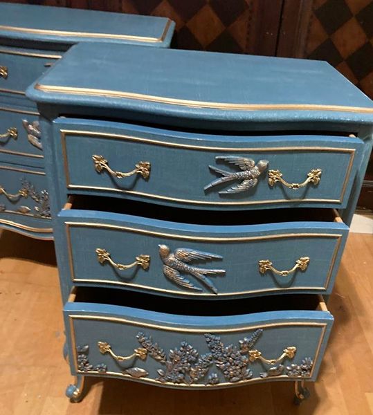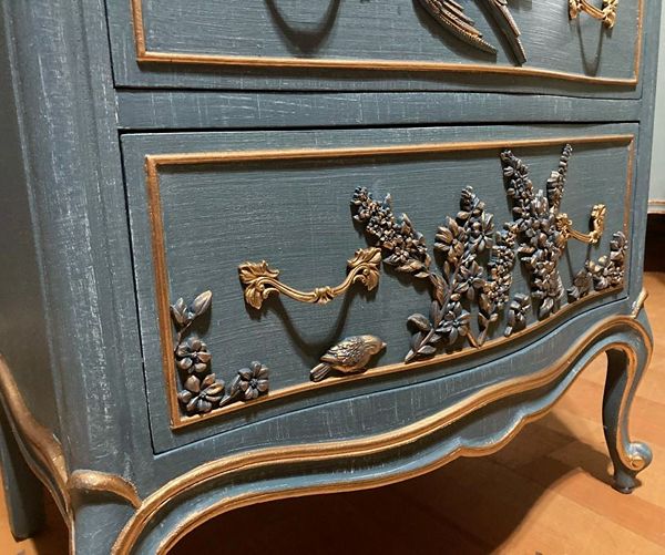 - We cleaned, filled, sanded, primed, added worn denim texture, applied hand poured moulds of birds and florals, then painted in layers, gilded and sealed for durability.