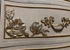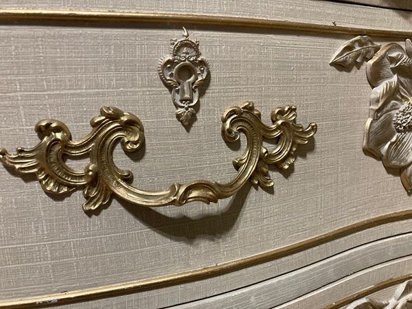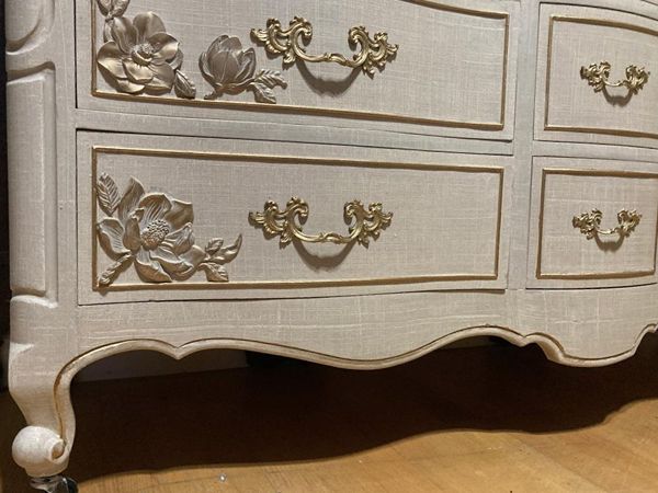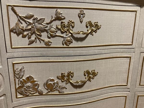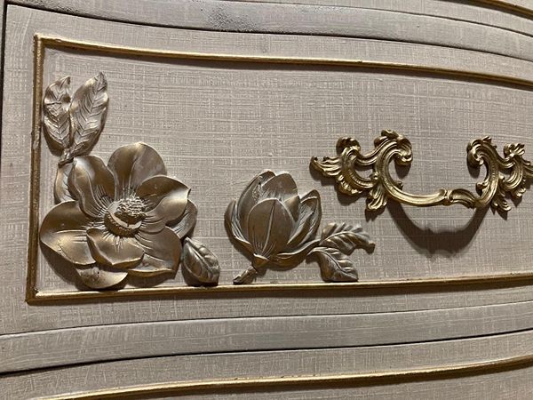 - We cleaned, filled, sanded, primed, added texture then lovely beige glazes in layers, Hand poured moulds of magnolias then attached, finally we gilded and sealed for durability.