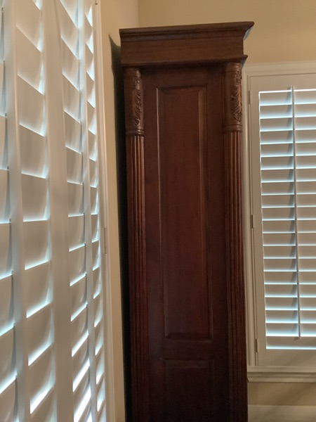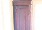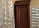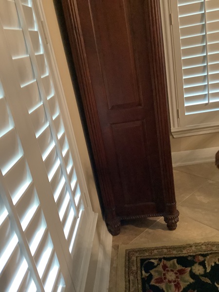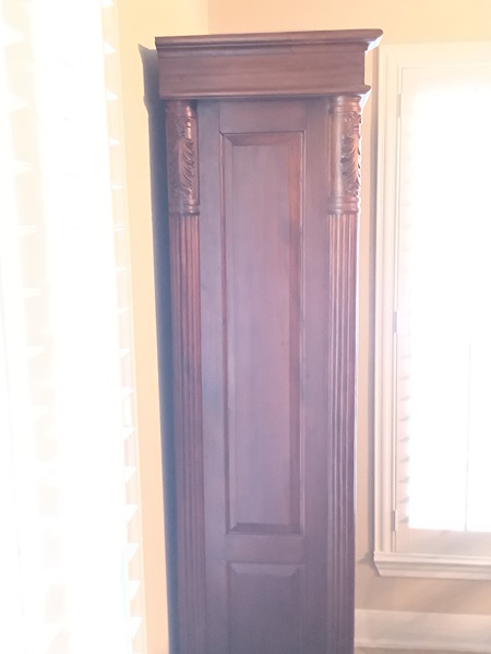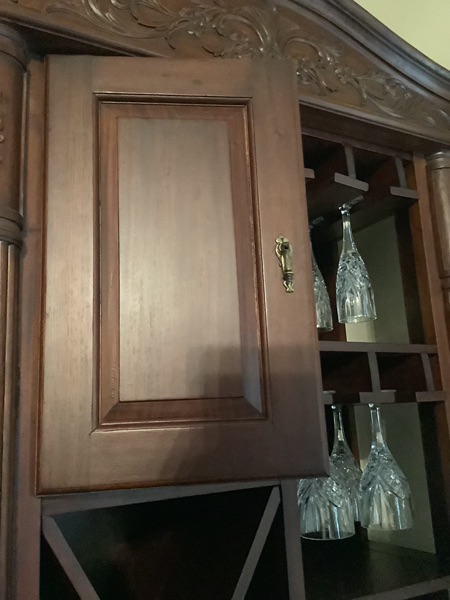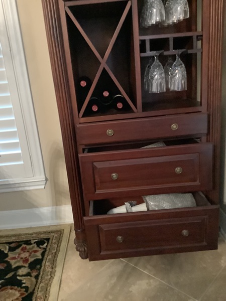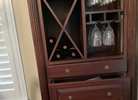 Custom cabinet made in Indonesia. I believe it's mango wood. Racks for hanging glasses, three drawers, storage for wine bottles, and cabinet door for more storage.