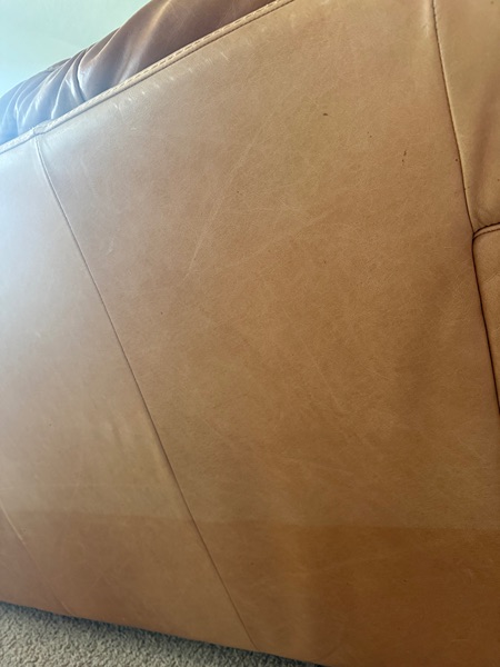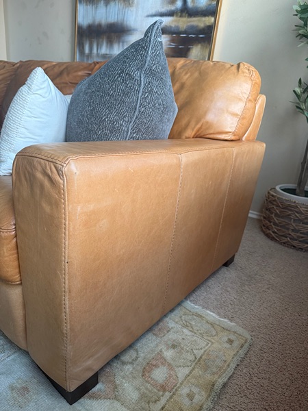 Gorgeous Chestnut color sofa from “Natuzzi Italia”. This color is BEAUTIFUL in person. Just been conditioned. Normal signs of wear that is perfectly worn in and gives it that distressed look. It is super sturdy. Deep seating for that extra comfort & All cushions are attached which everything will stay in place. Built to LAST. Slight discoloration on the back side.