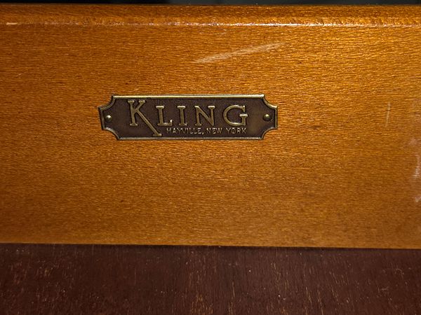 This is a dresser I got from my mother, you got it from her uncle. Manufactured by Kling in NY. Tope drawers have compartments, and tongue and groove construction. Top needs refinishing.
