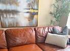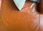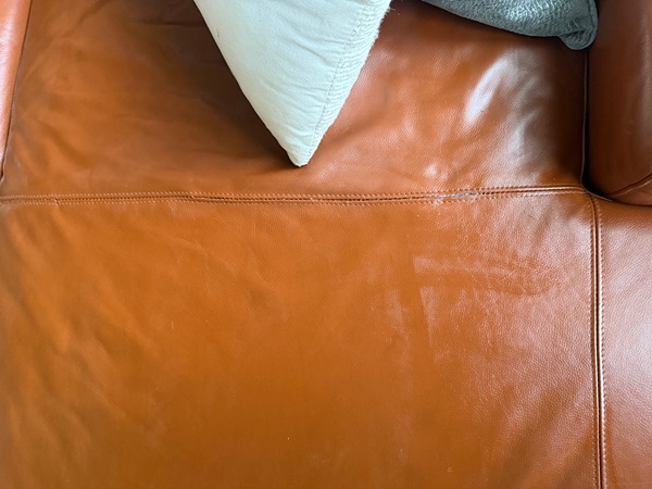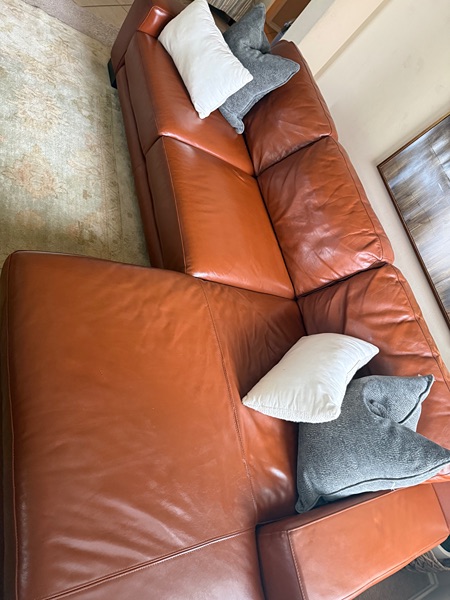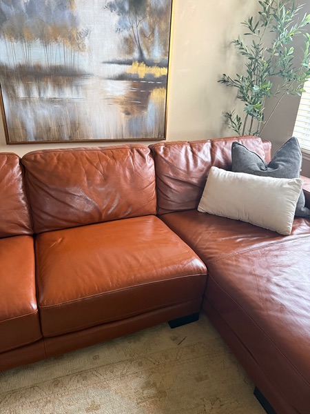 Beautiful Saddle Color! It’s in great condition. Very minimal wear. A slight tear on the chaise part (it was previously bonded) doesn’t affect the couch. Sits comfortably. No stains or rips.