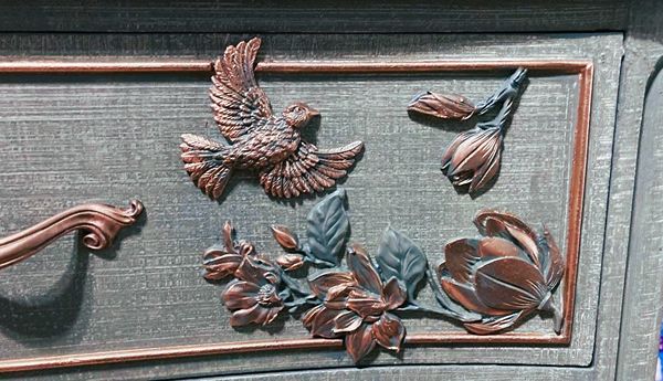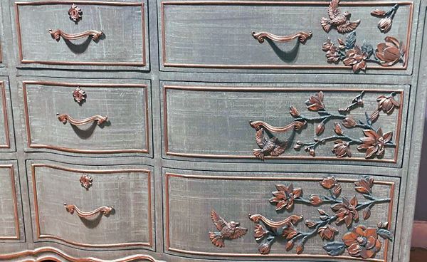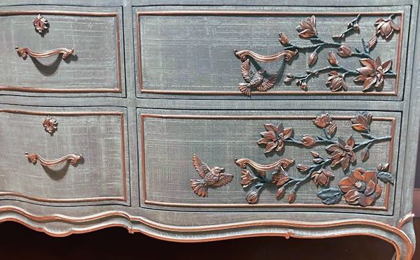 - We cleaned, filled, sanded, primed, added a cozy linen texture, hand poured moulds of birds and magnolia branches in bloom, composed and attached each one, then painted in layers for beautiful depth, finally I gilded and sealed for durability.