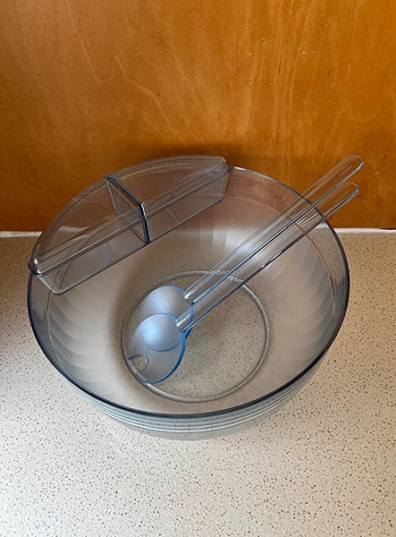 This item is a vintage Tupperware Preludio acrylic salad/snack punch bowl set in clear blue.